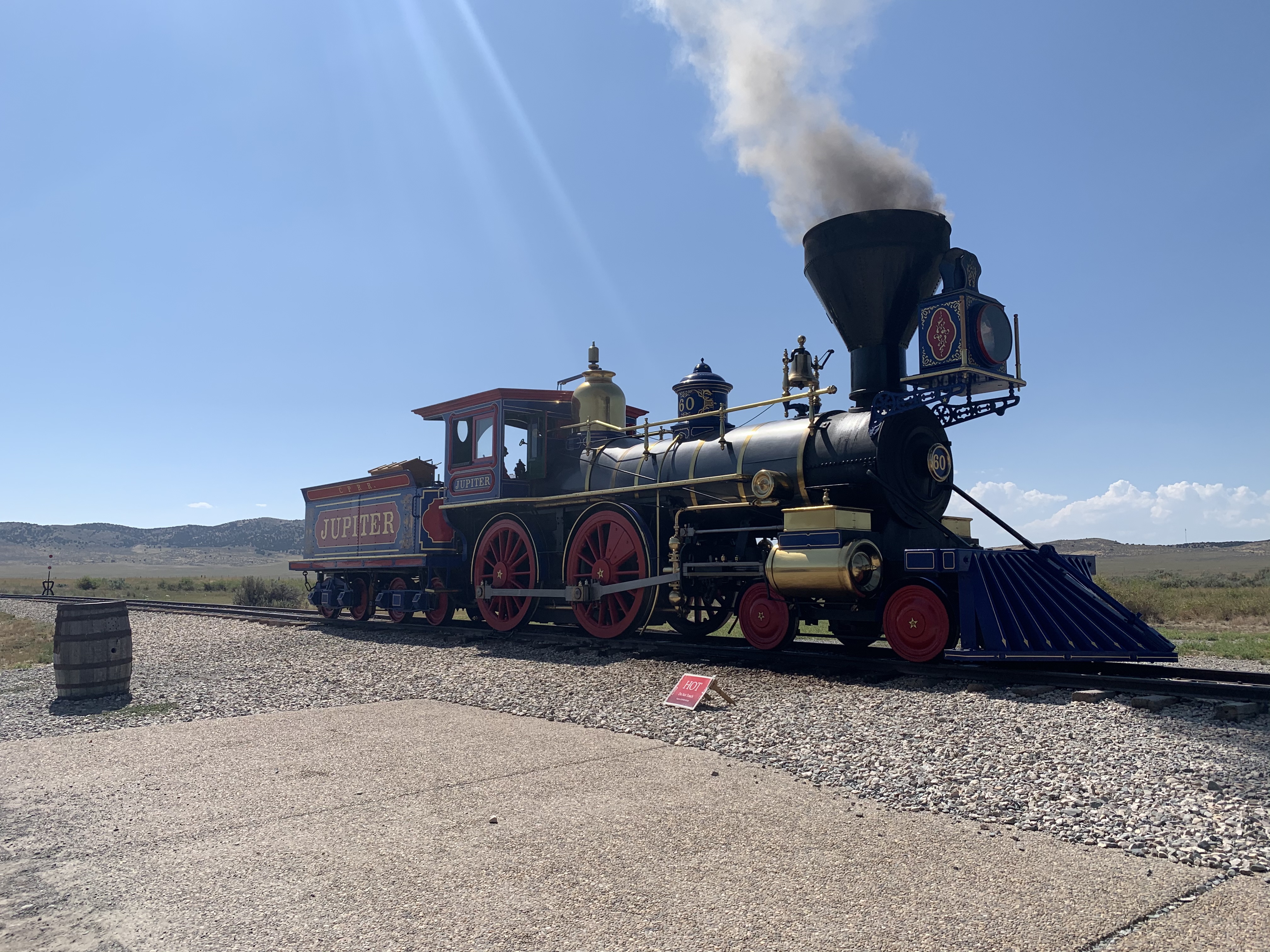 Man, it was hot out there! 100 degrees. The visitor’s center was closed, but the bookstore was open. The park has been able to maintain operations throughout COVID-19 because it is almost entirely an outdoor park. There are two working replica trains–one coal powered and one wood powered. During scheduled times of the day, conductors move the trains while a ranger talks about the machines and the history of the West as the Transcontinental Railroad was being built.