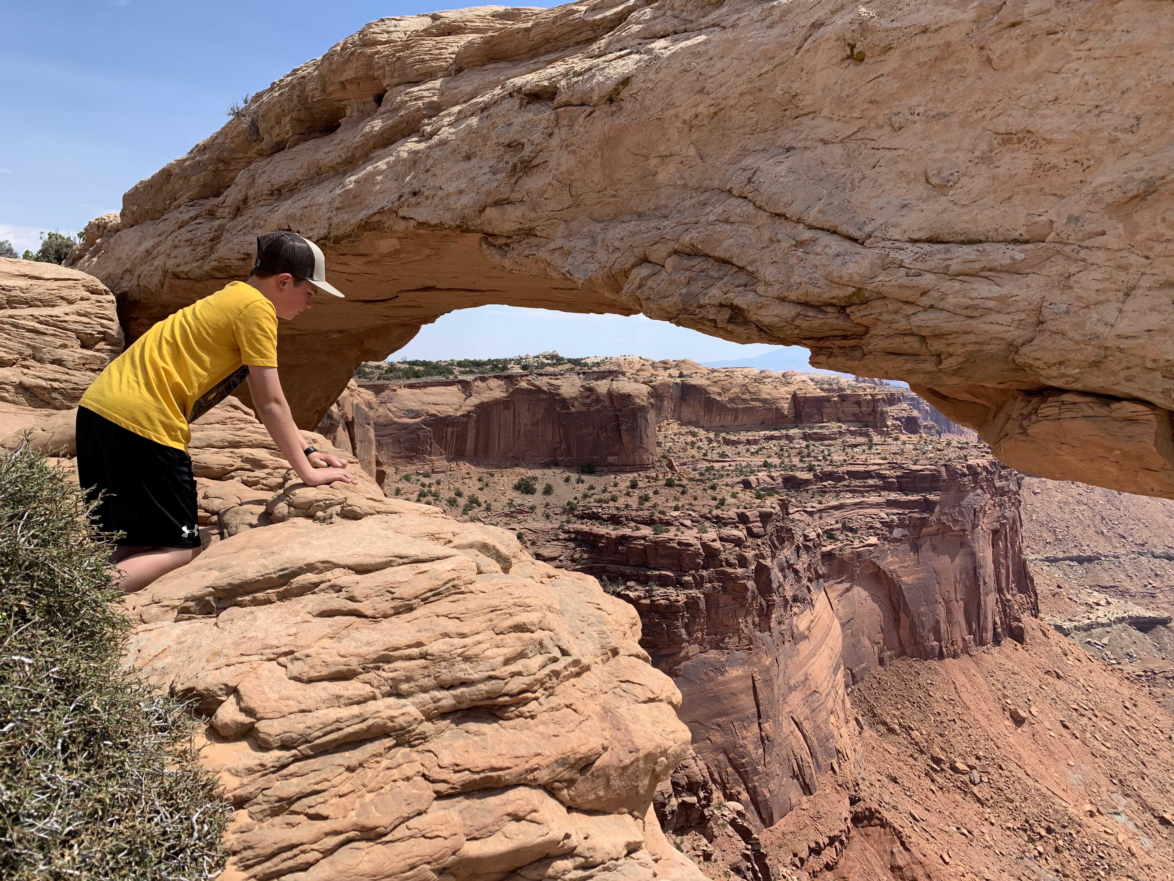 The walk to Mesa Arch was short and sweet. 0.5 miles round trip to the overlook. Y’all, it was BREATH-TAKING. That whole area was amazing. My bigger kids practiced their rock-climbing skills on the huge boulders, while Morgan found another beloved rock and stick. I can’t stress the beauty of this spot; I’m sure that my photos won’t do it justice. It’s just impossible to capture the VASTNESS of the space. You can only see such a small part of it through the camera.