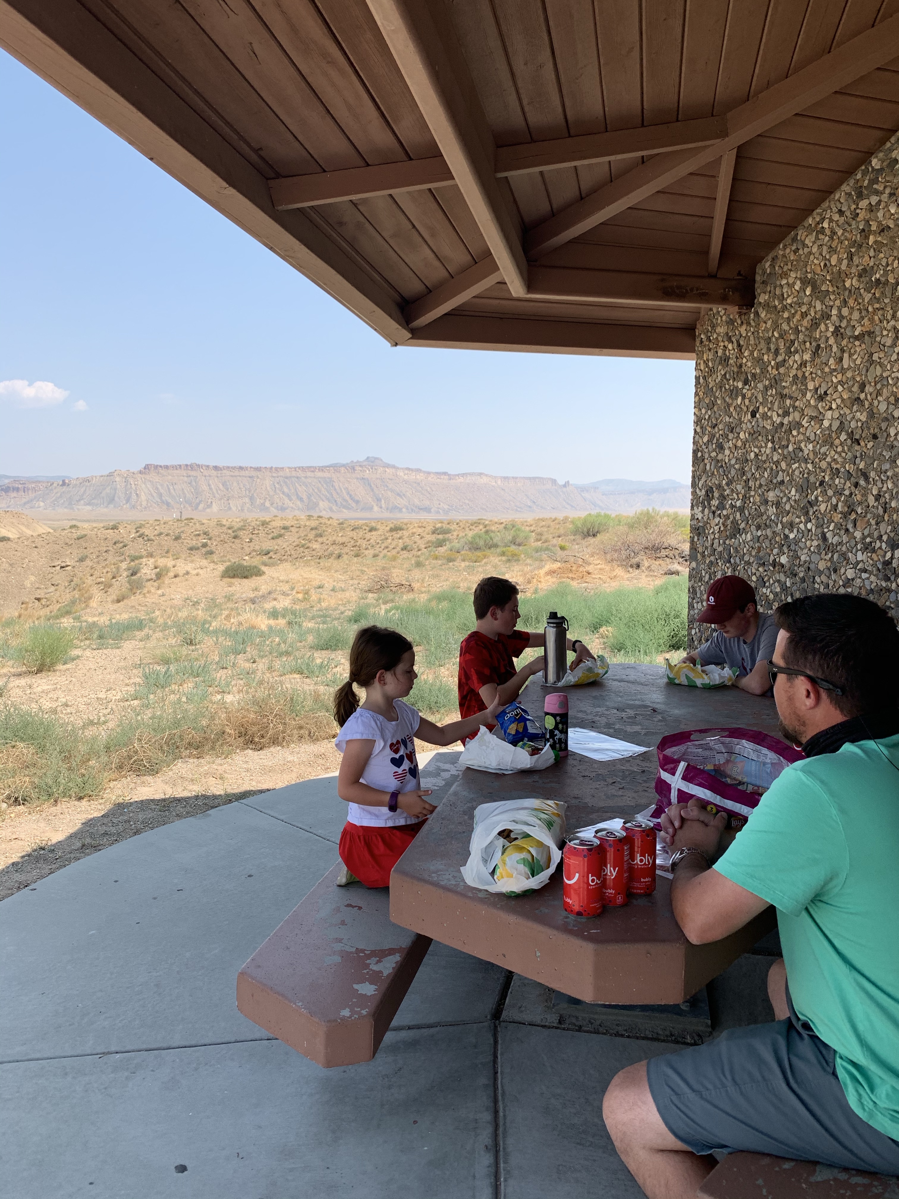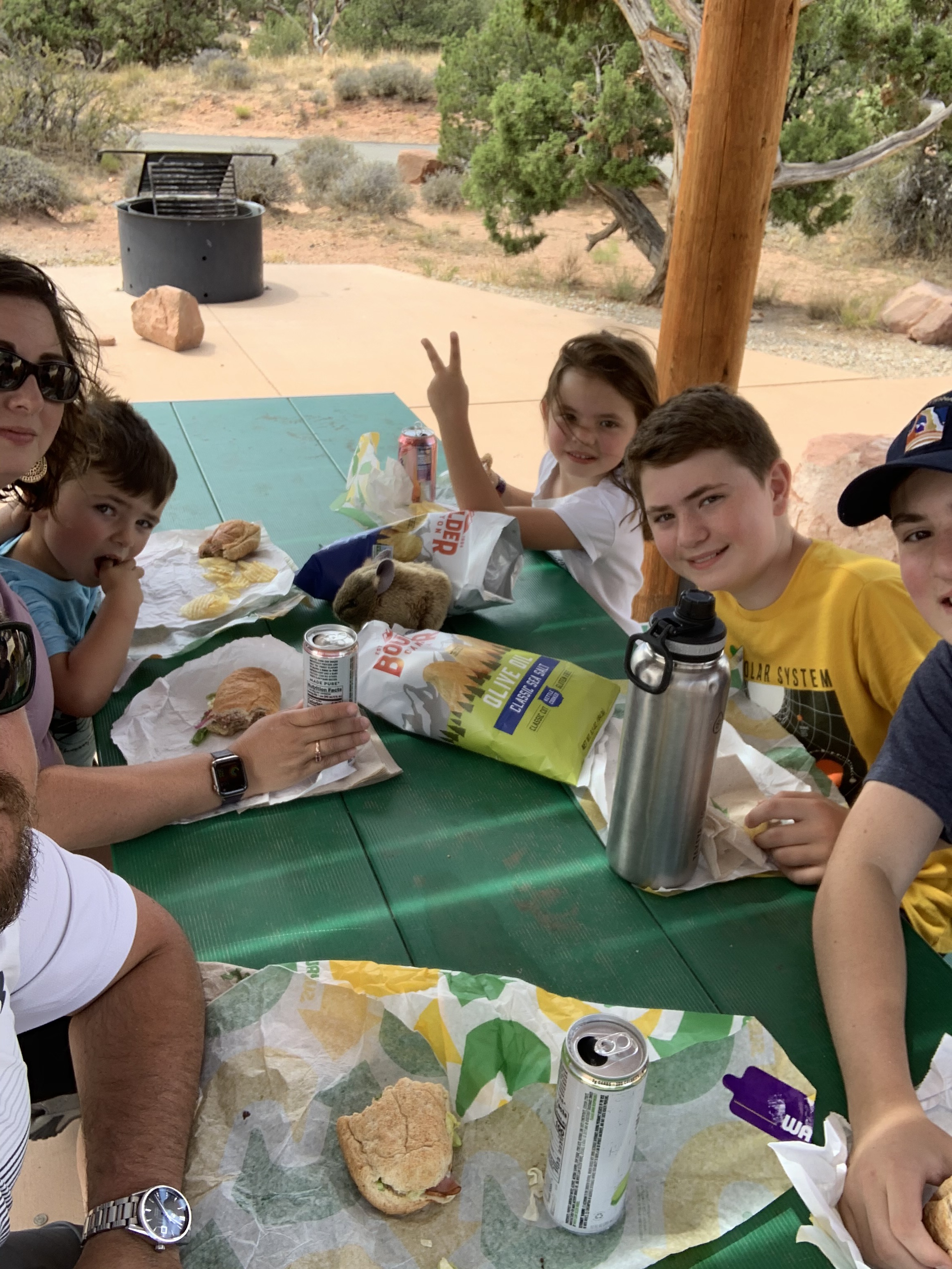 Stopped for lunch at another rest stop. We had picked up Subway sandwiches in Moab before we left and ate just before we got to Arches National Park at a covered table at the rest stop. It was just over 100 degrees out and no natural shade. Nice lunch break, though!
