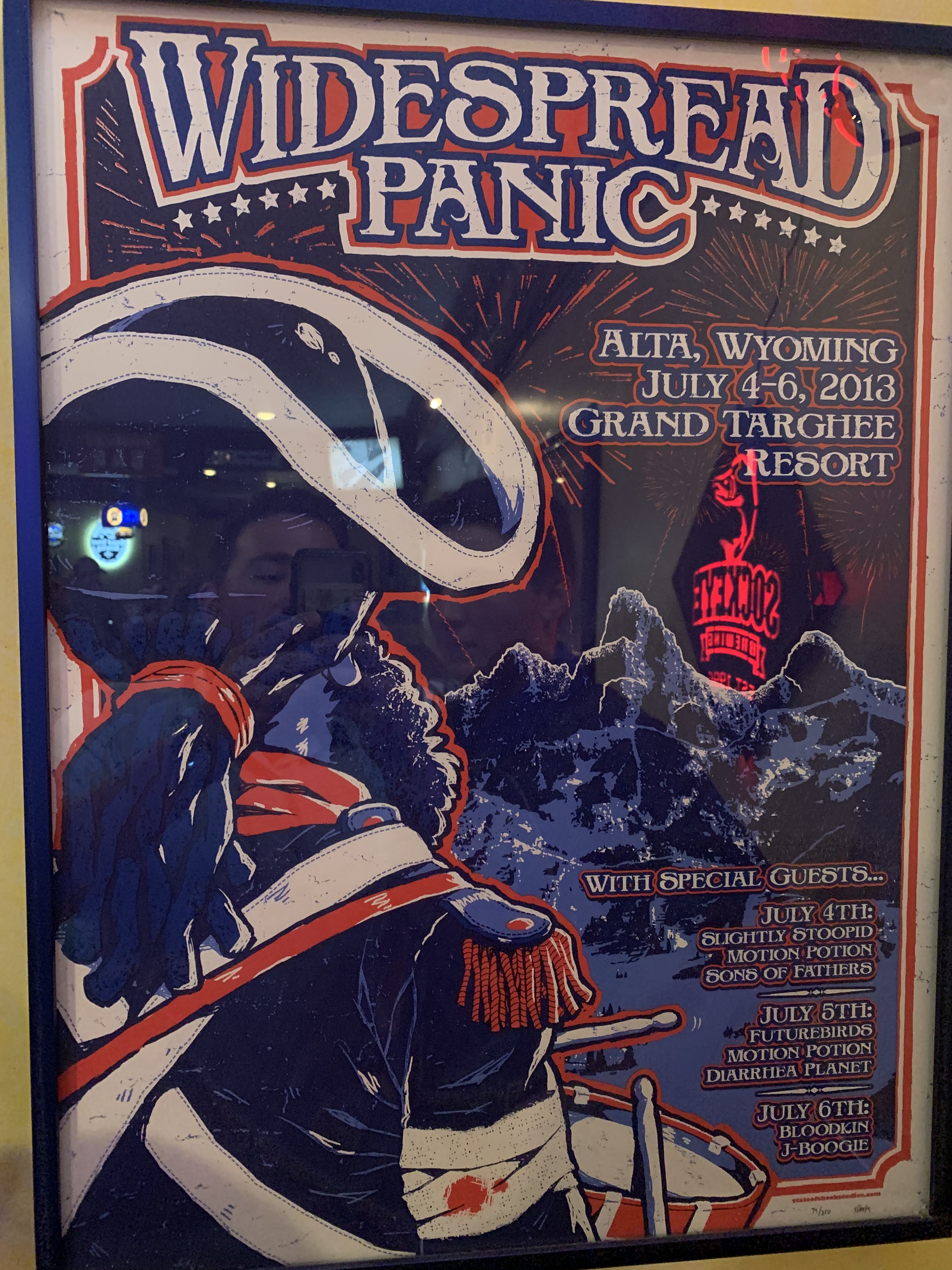 Back at the house, we figured out where we wanted to eat dinner. The Royal Wolf in Driggs made the final cut. We ended up eating inside as there was a wait for patio seating. This restaurant required masks when moving around inside. The menu provided lots of options–Kevin had a some pork “wings;” I had ravioli; Edwin had a Philly cheese steak sandwich. (Kevin wants me to add that the French fries made with Idaho potatoes were amazing.) Another “small world” moment. There was a Widespread Panic poster hanging in the restaurant. Widespread Panic started in my hometown of Athens. The lead singer of the band frequents Clarkesville; his wife has a business there, too.