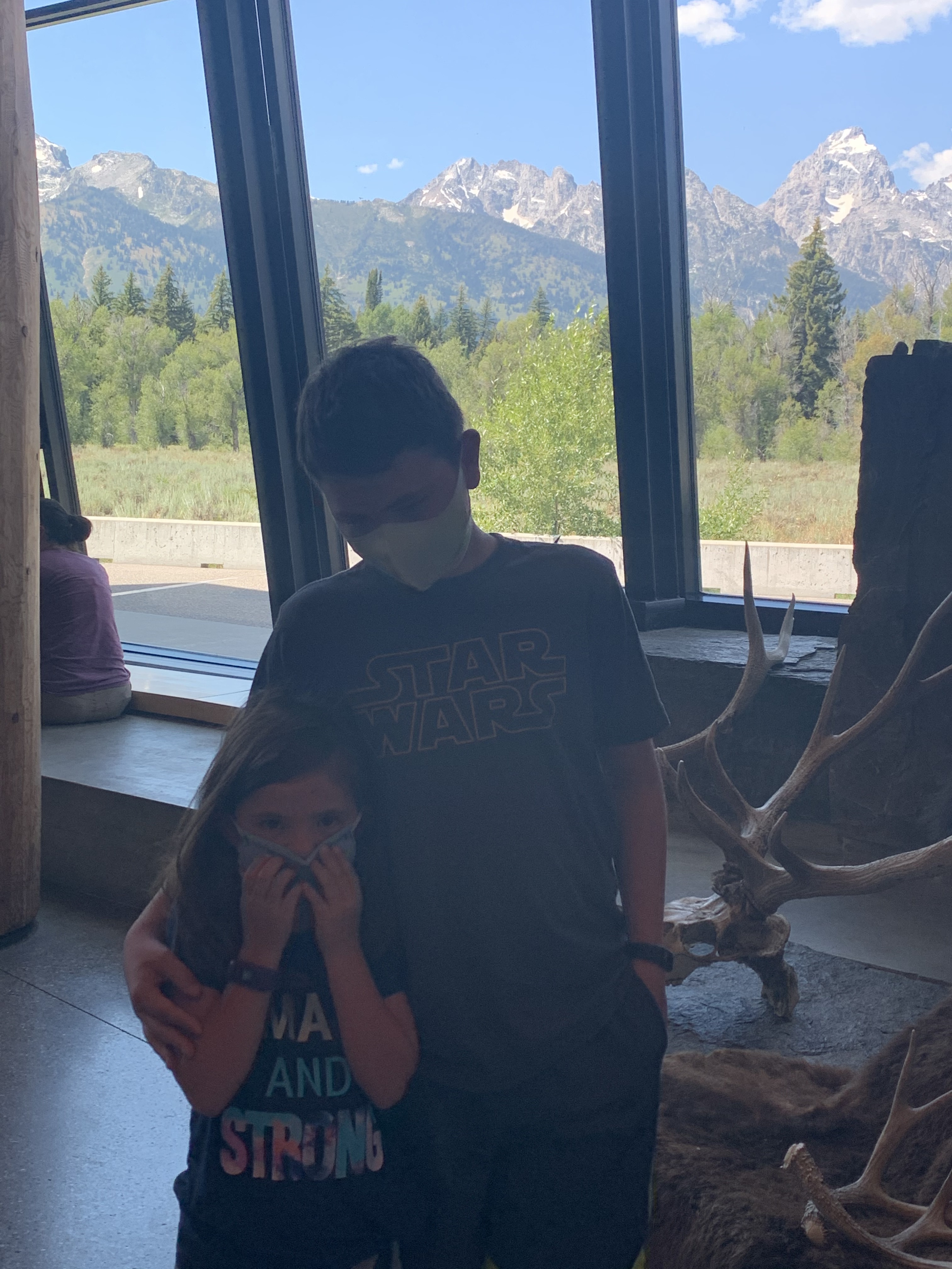 After lunch, we went to the visitor’s center at Grand Teton National Park. It had some cool exhibits. Lillie especially liked the animal footprint signs on the floor encouraging social distancing. She found one for a pika–a small mouse that lives in this area. Lillie told a nurse last week during a test that a pika was her favorite animal. (I can about guarantee that I have the ONLY six-year old who’s favorite animal is a pika.) We bought souvenirs in the gift shop. (Limit of 15 customers at a time in the store.) The cashier was also from Georgia–in between Columbus and Macon. (Kevin called her out on her accent.)