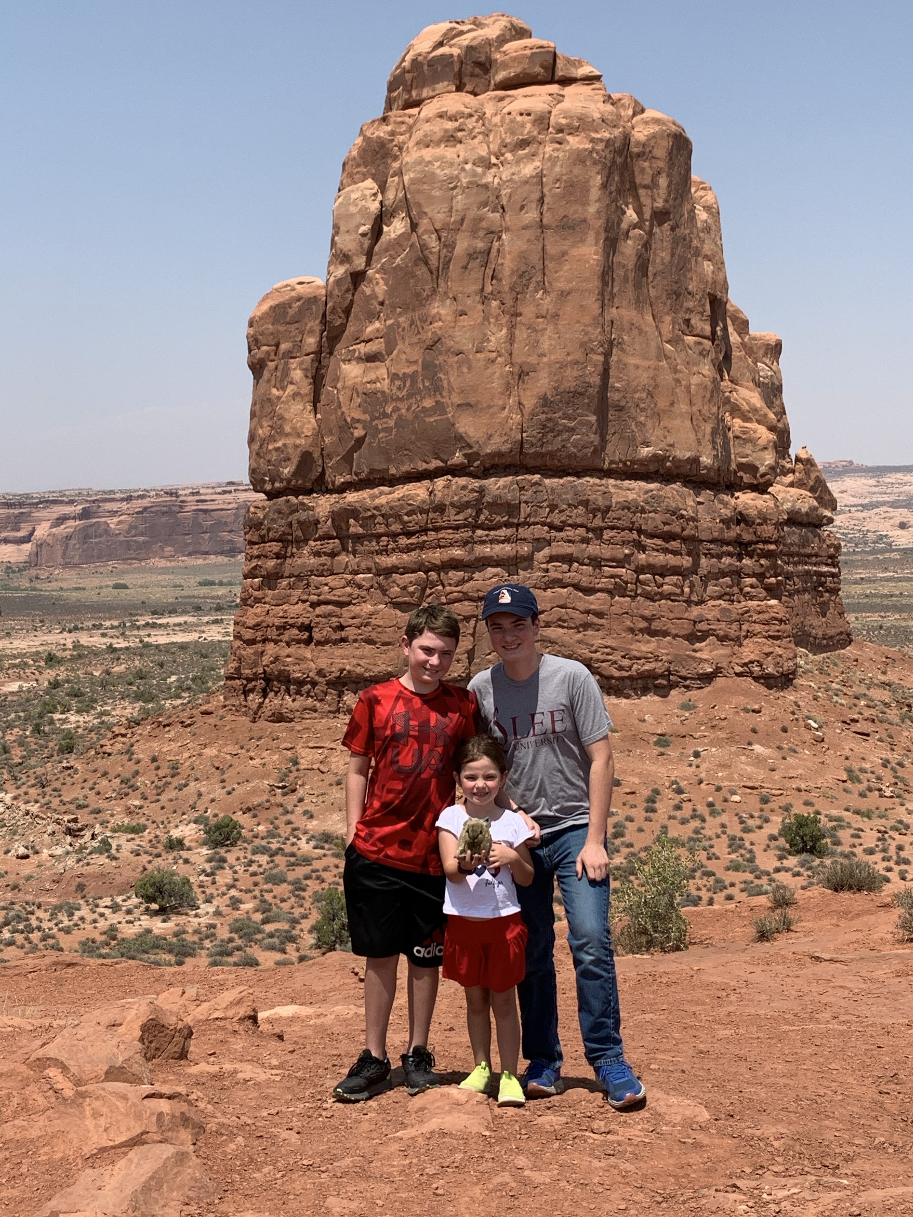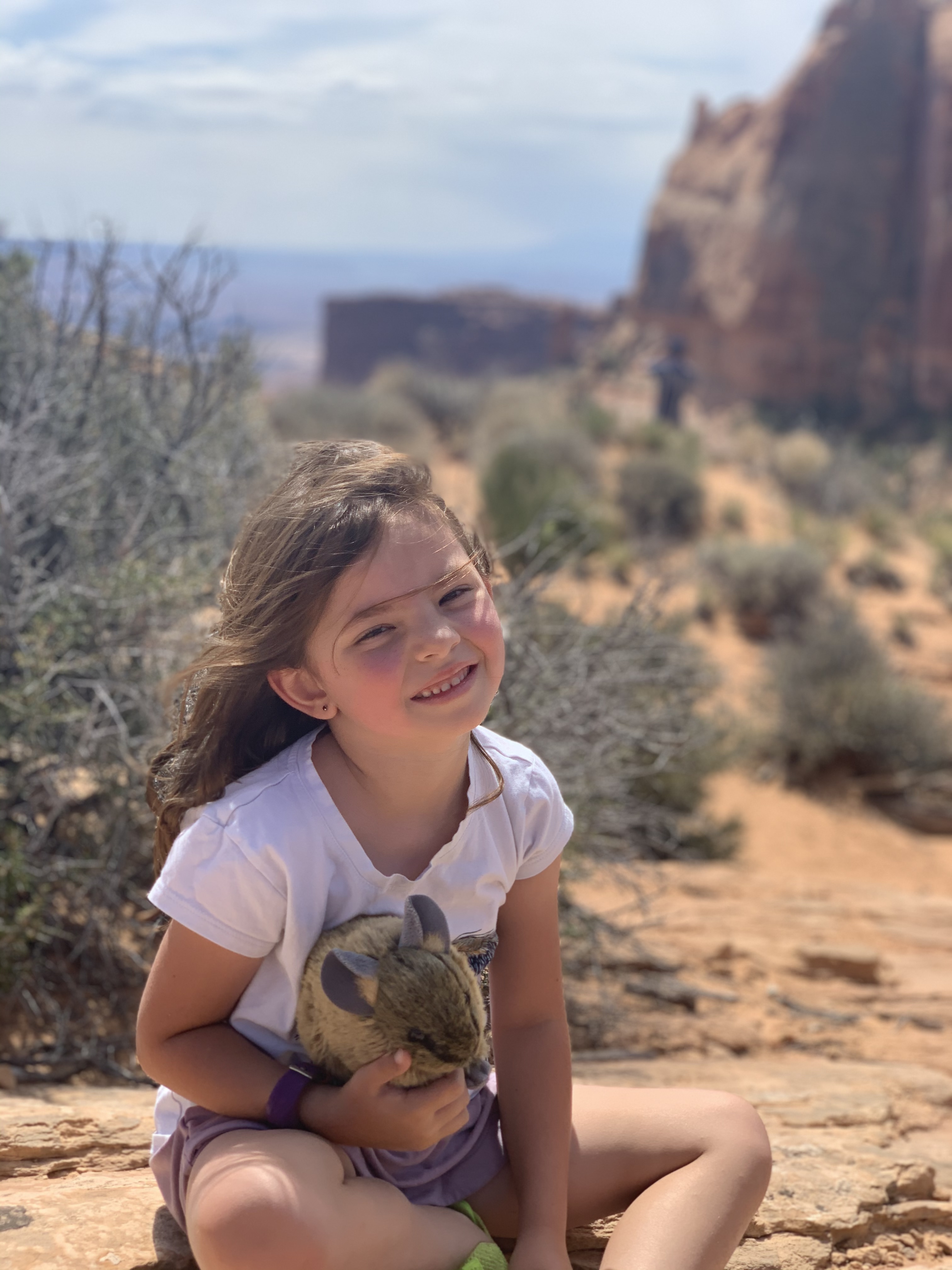 At Arches, we started at the visitor’s center. I wasn’t planning on getting the kids any more junk, but they had a stuffed pika–Lillian’s favorite animal. I just had to get it for her. I don’t know of any other place to get a stuffed pica. She was thrilled and named it Peanut. Peanut quickly became the new star of our pictures.