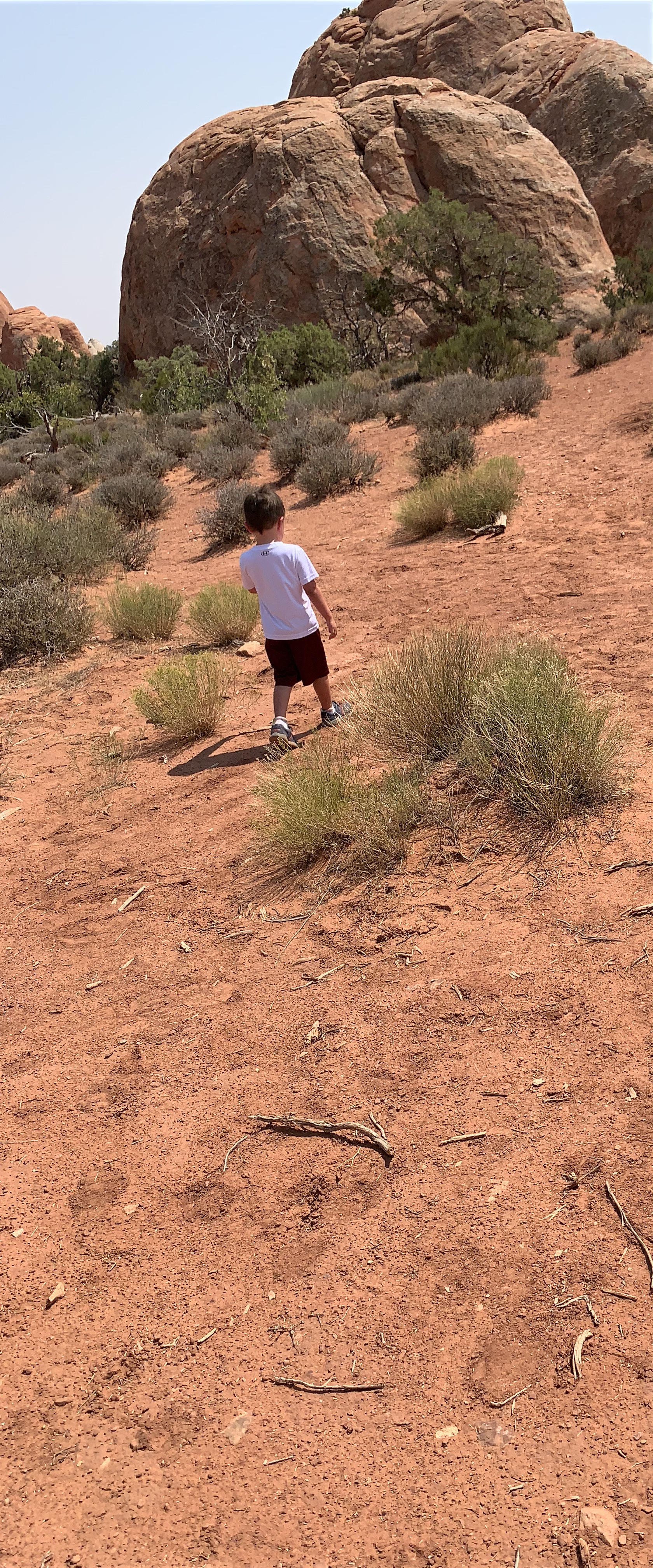Kevin, Edwin, Mont, and Lillian took the short hike to the Lower Delicate Arch Viewpoint. I waited in the car with Morgan; he was a little grump. Winding around to the northern point of the park, the main park road connected to an unpaved dirt road. We love a dirt road! Arches has lots of optional dirt road trails. The park map is clearly marked showing unpaved 2-wheel drive roads and, also, the rougher 4-wheel drive roads. Our rental car has 4-wheel drive, so we did attempt one of those roads in the Salt Valley area, but it was too much for our Ford Expedition. We would have needed a Jeep and, of course, we can’t all fit in a Jeep. It was still a fun side trip.