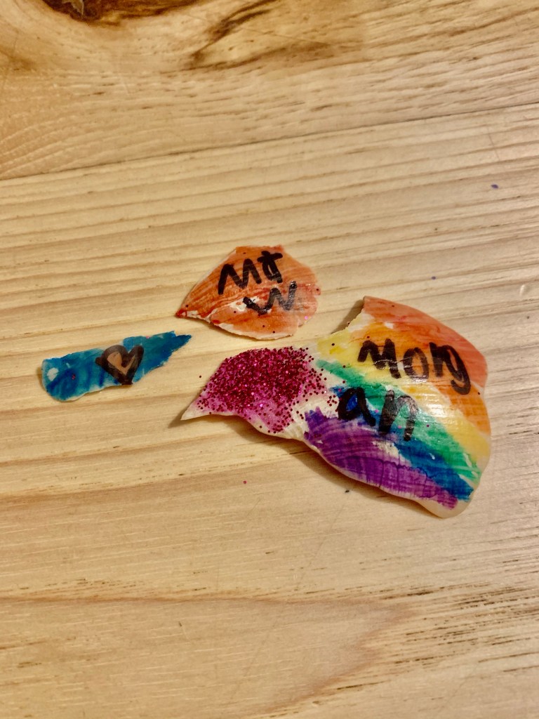 Meanwhile, my Lillian…my dear six-year-old daughter, was inspired by my broken-pottery story. She swept up the three little broken pieces and took them to her bedroom. What she came back with mere minutes later brought a fresh well of tears. She had painted the shells with rainbows, put Morgan’s name and his initials…and a heart. Added glitter. Y’all, it was one of the sweetest things ever. I hugged her and told her how much I love her.