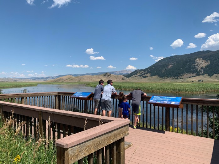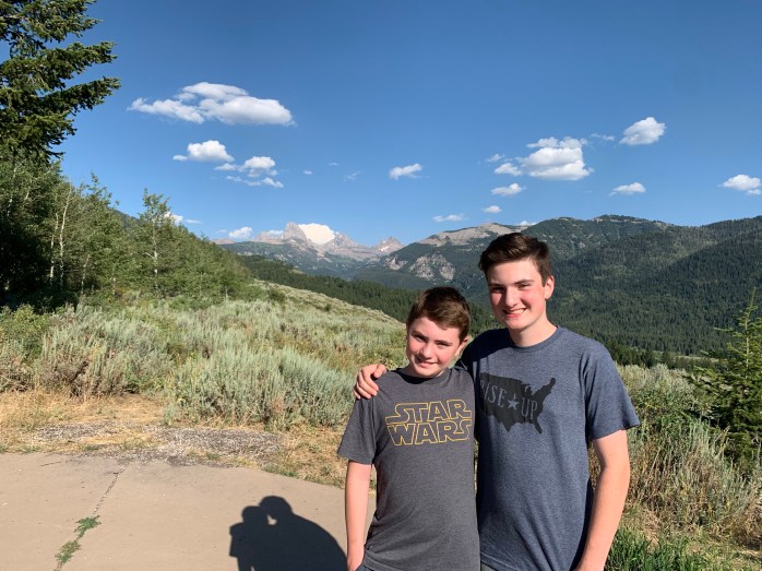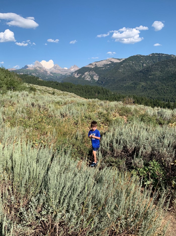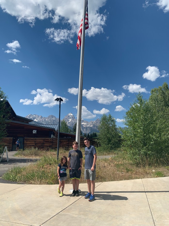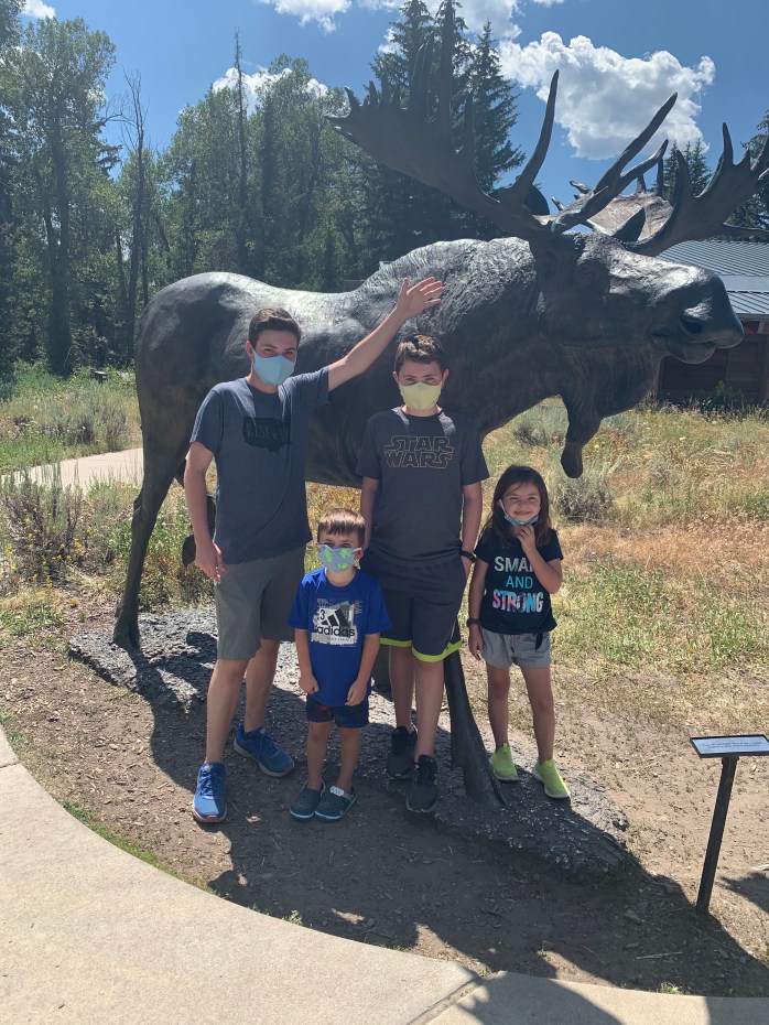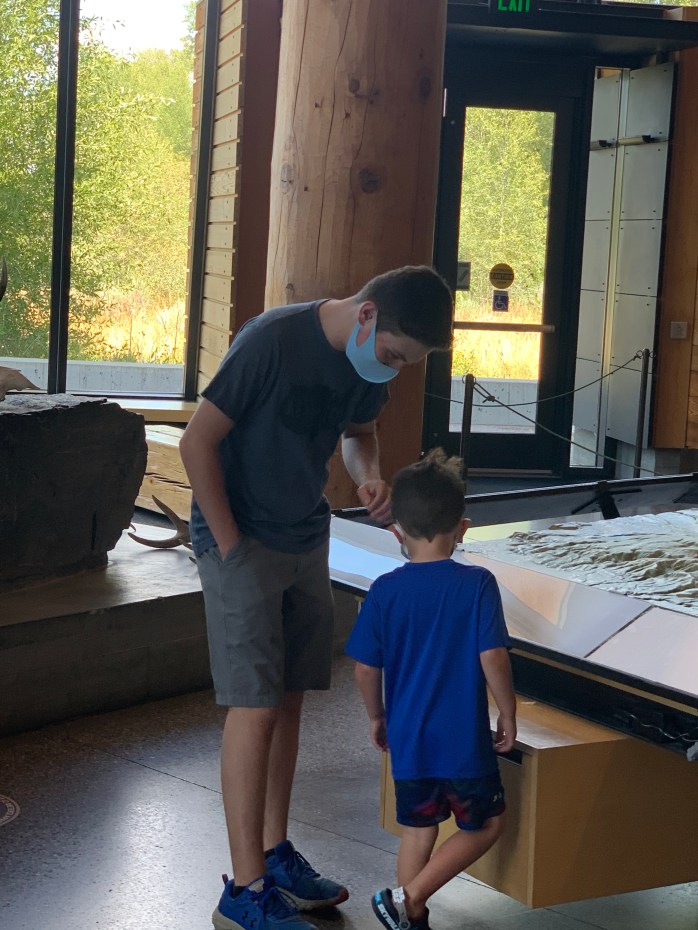 After lunch, we went to the visitor’s center at Grand Teton National Park. It had some cool exhibits. Lillie especially liked the animal footprint signs on the floor encouraging social distancing. She found one for a pika–a small mouse that lives in this area. Lillie told a nurse last week during a test that a pika was her favorite animal. (I can about guarantee that I have the ONLY six-year old who’s favorite animal is a pika.) We bought souvenirs in the gift shop. (Limit of 15 customers at a time in the store.) The cashier was also from Georgia–in between Columbus and Macon. (Kevin called her out on her accent.)