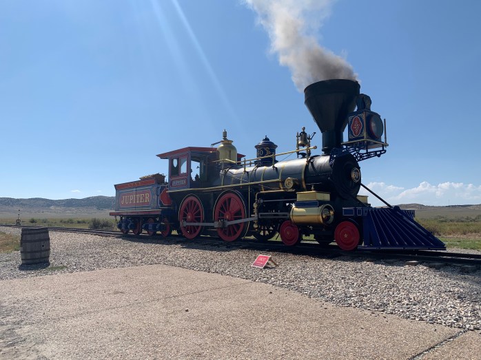 Man, it was hot out there! 100 degrees. The visitor’s center was closed, but the bookstore was open. The park has been able to maintain operations throughout COVID-19 because it is almost entirely an outdoor park. There are two working replica trains–one coal powered and one wood powered. During scheduled times of the day, conductors move the trains while a ranger talks about the machines and the history of the West as the Transcontinental Railroad was being built.