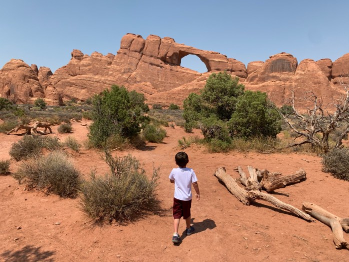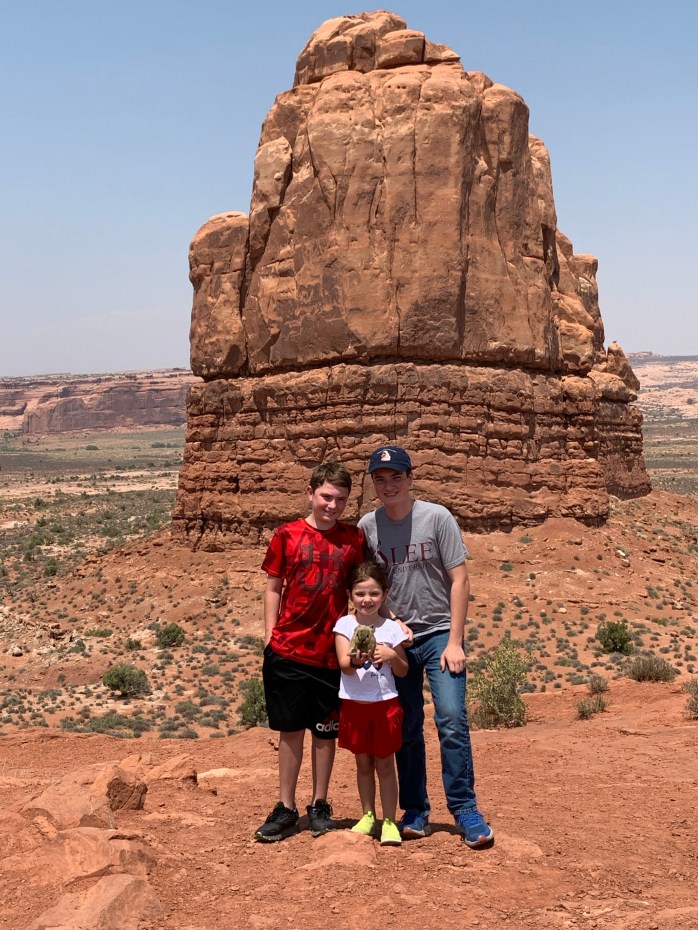 Kevin, Edwin, Mont, and Lillian took the short hike to the Lower Delicate Arch Viewpoint. I waited in the car with Morgan; he was a little grump. Winding around to the northern point of the park, the main park road connected to an unpaved dirt road. We love a dirt road! Arches has lots of optional dirt road trails. The park map is clearly marked showing unpaved 2-wheel drive roads and, also, the rougher 4-wheel drive roads. Our rental car has 4-wheel drive, so we did attempt one of those roads in the Salt Valley area, but it was too much for our Ford Expedition. We would have needed a Jeep and, of course, we can’t all fit in a Jeep. It was still a fun side trip.