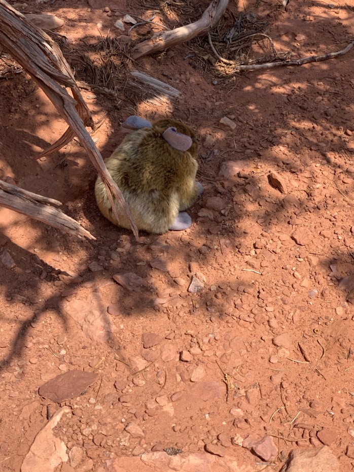 At Arches, we started at the visitor’s center. I wasn’t planning on getting the kids any more junk, but they had a stuffed pika–Lillian’s favorite animal. I just had to get it for her. I don’t know of any other place to get a stuffed pica. She was thrilled and named it Peanut. Peanut quickly became the new star of our pictures.