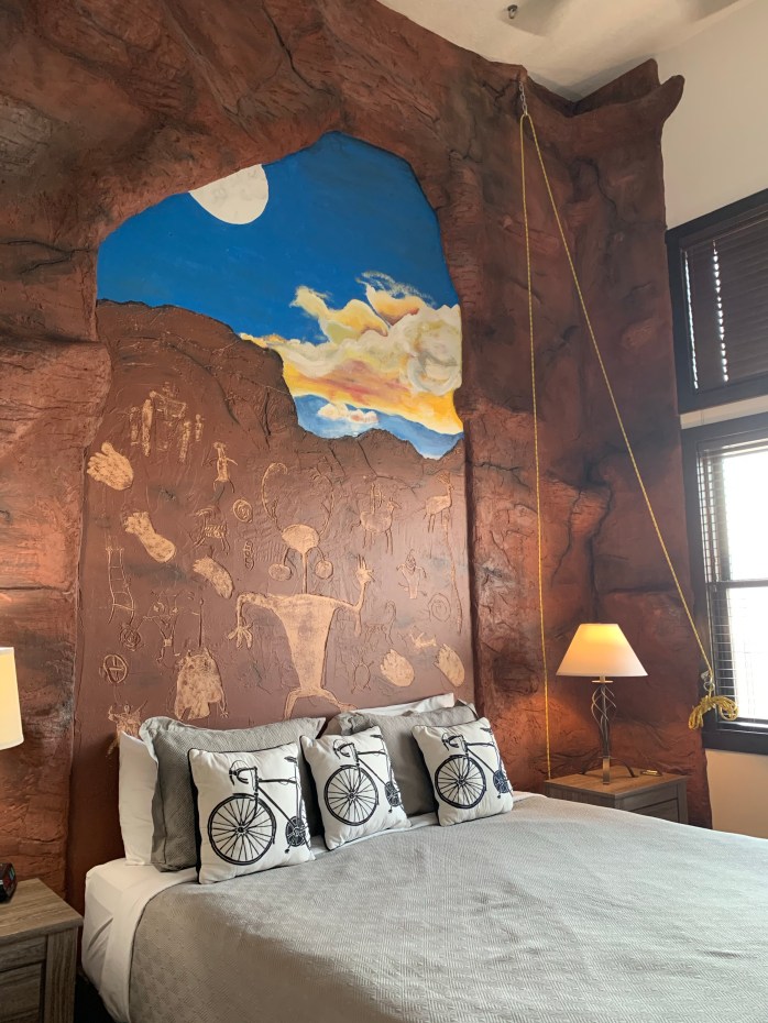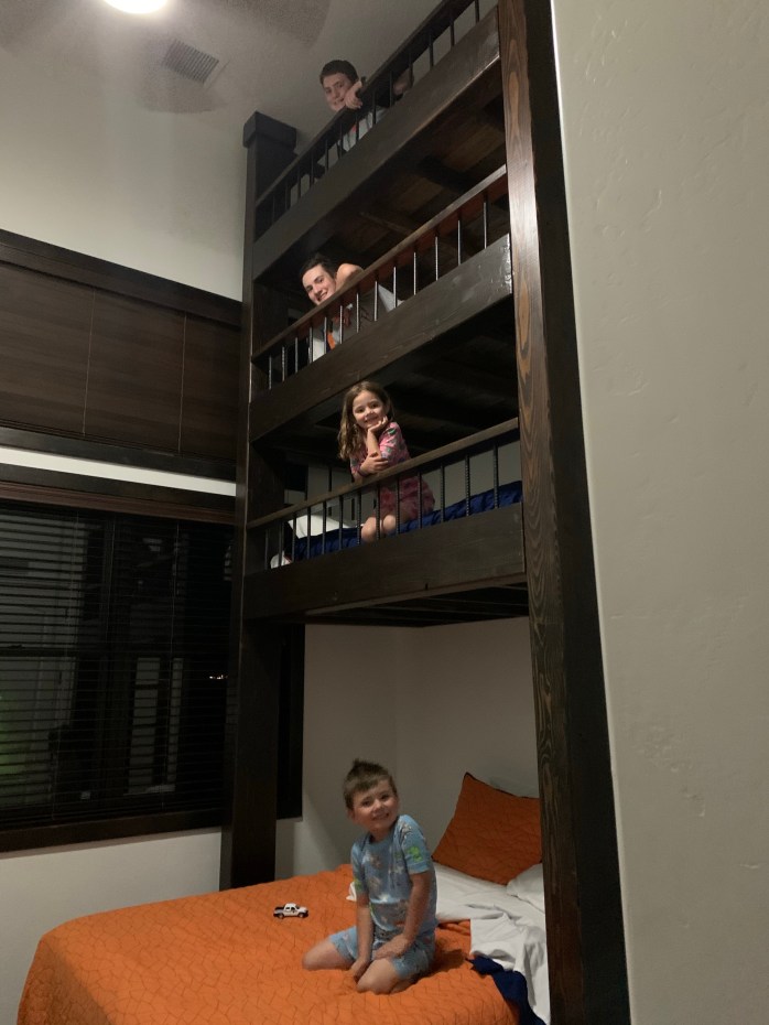 Exiting the park, we headed on the few miles to Moab. I was really excited for the kids to see the Airbnb that I had reserved. It was a 2 bedroom/2 bathroom apartment with a CLIMBING WALL in the master bedroom and a FOUR-STORY BUNKBED in the second bedroom. It was one of the most unique places I have ever stayed. Mont scrambled to claim the top bunk and figured out how to slide down the fireman’s pole.