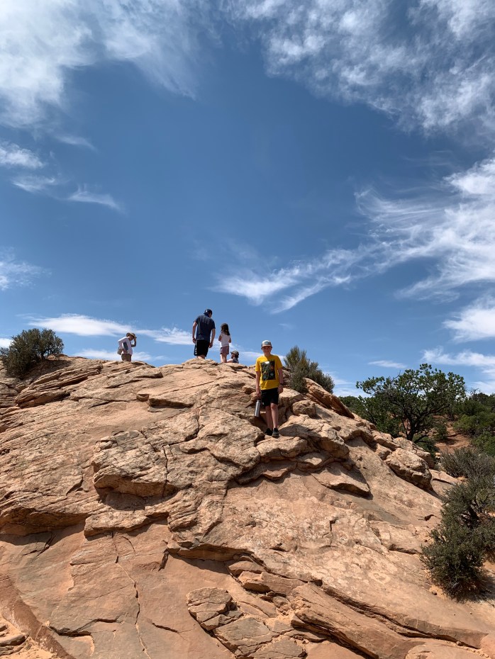 The walk to Mesa Arch was short and sweet. 0.5 miles round trip to the overlook. Y’all, it was BREATH-TAKING. That whole area was amazing. My bigger kids practiced their rock-climbing skills on the huge boulders, while Morgan found another beloved rock and stick. I can’t stress the beauty of this spot; I’m sure that my photos won’t do it justice. It’s just impossible to capture the VASTNESS of the space. You can only see such a small part of it through the camera.
