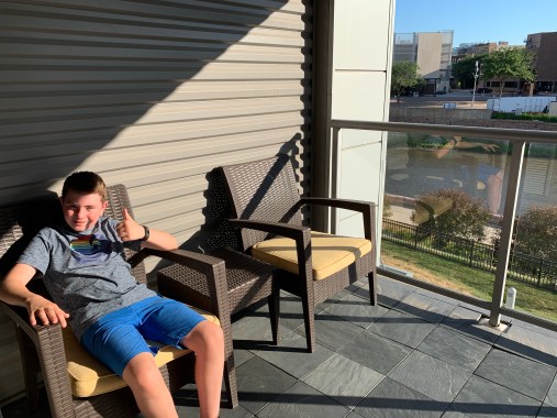 We drove on to Sioux Falls and stayed at the Hilton Garden Inn Downtown on the river. We had two adjoining rooms–Edwin and Mont got the queen beds in one room, Kevin and I claimed the king bed in the other, and Lillie and Morgan shared the pull-out couch. We have a great view of the water from the porch off of our suite.