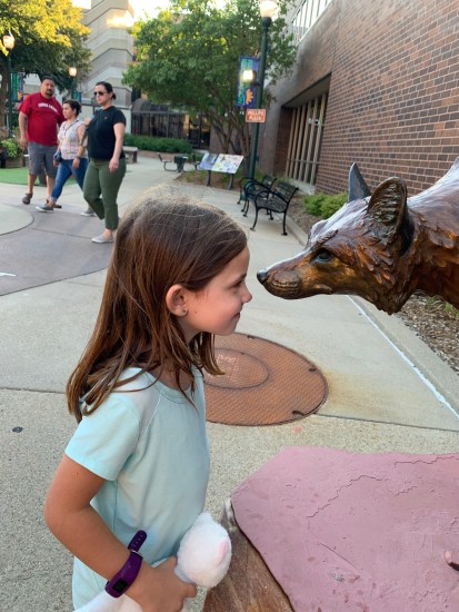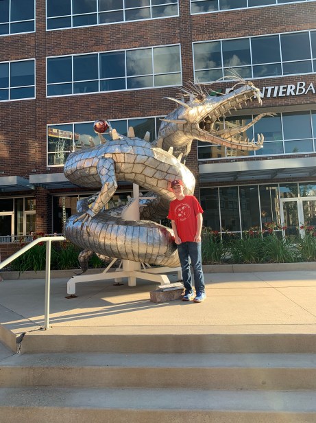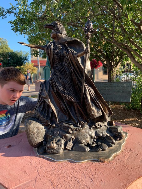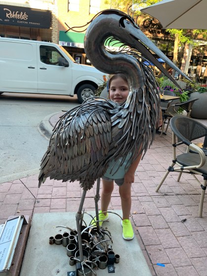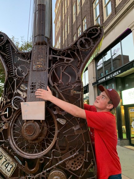 Walking around downtown to find dinner, we were delighted at the city’s Sculpturewalk. There are over 60 sculptures dotting the downtown area. These sculptures are generally traded out annually, but the process had to be adapted this year. We found an Irish Pub for dinner–delicious food and great service. Bangers and mash, anyone?