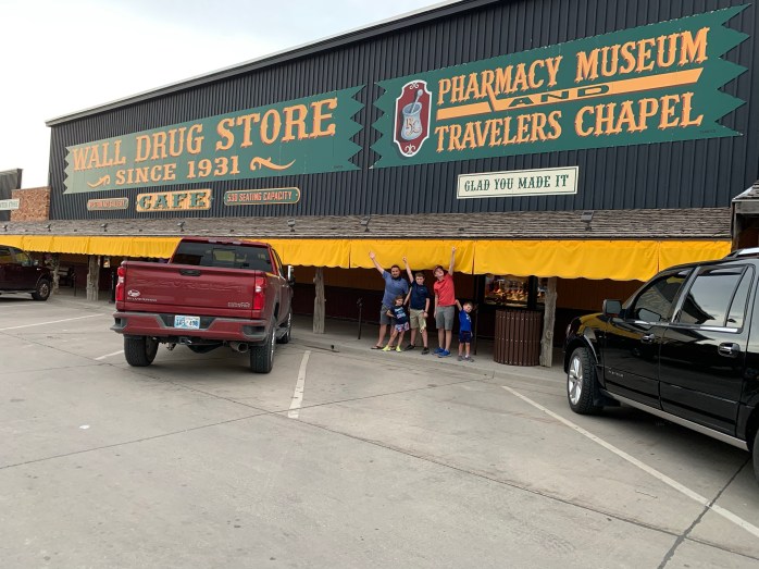 Next stop was Wall Drug. You can’t drive across South Dakota and NOT stop at Wall Drug. There are signs for hundreds of miles counting down the distance and advertising their wares. We used the bathroom (again) and got fresh doughnuts.