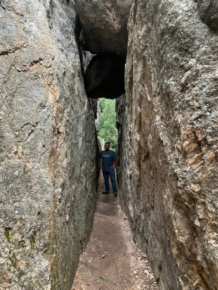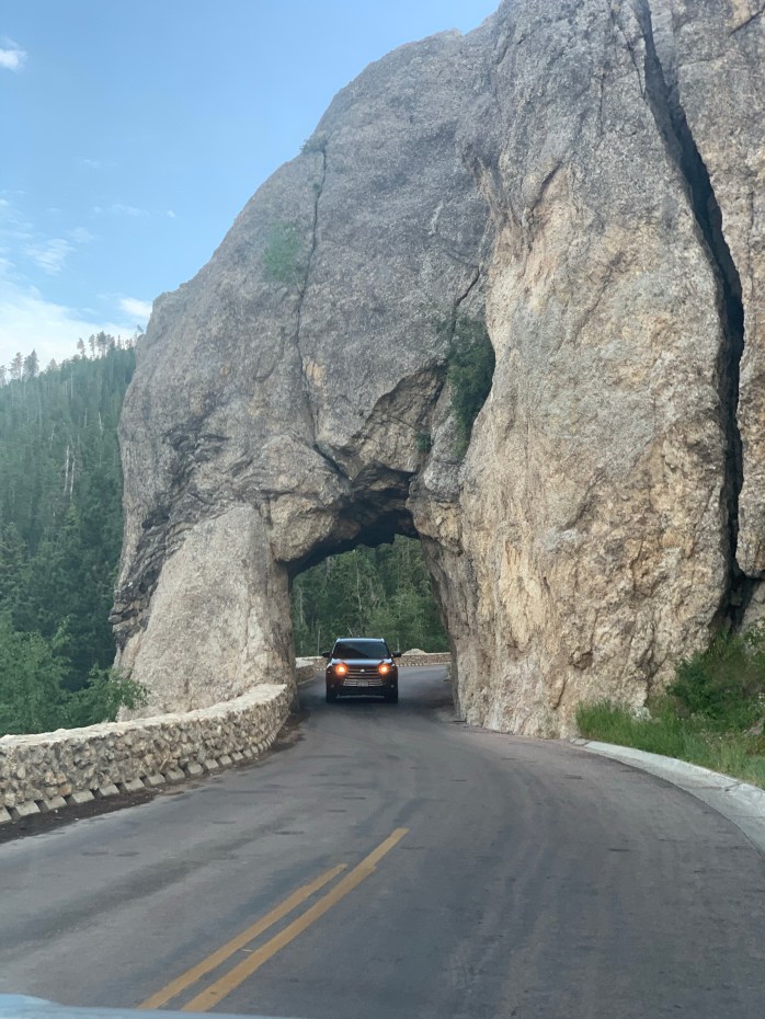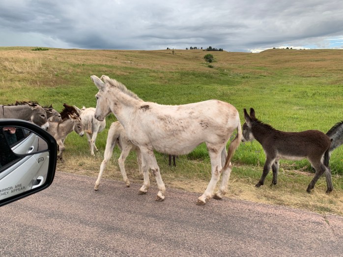 Our pass around the Custer State Park loop had some amazing scenery, but I was disappointed at the lack of wildlife that we saw. When we went through Custer 14 years ago when Edwin was a baby, buffalo came up to our car. This time we saw two herds, but they were way off in the distance. The animals that we DID see in the park are the same ones that we can see at home–donkeys, turkeys, and deer. There were donkeys in the 1930s that were used for tours. At some point, they were released and roam freely around the park. They are called the “begging burros” as they will come up to to tourists looking for treats.