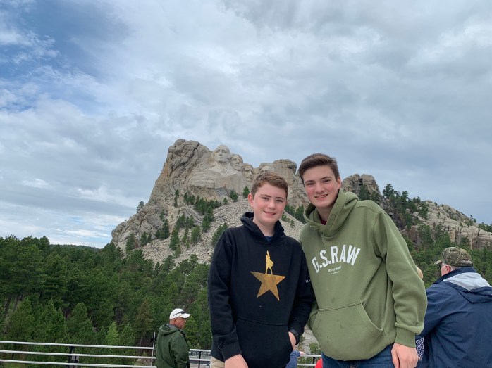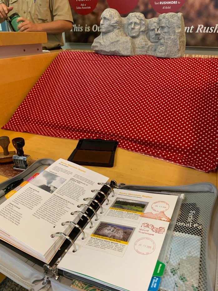 First up TODAY: Mount Rushmore! The place that we were staying inside of Custer State Park is a very short drive from Mount Rushmore National Park. (Another stamp for me, yay!) We walked the short Presidential Trail around the base of the monument. The trail is short–only 0.6 mile, but there are 422 steps. If you go one way, most of the steps are down; if you go the other way, they are mostly up.