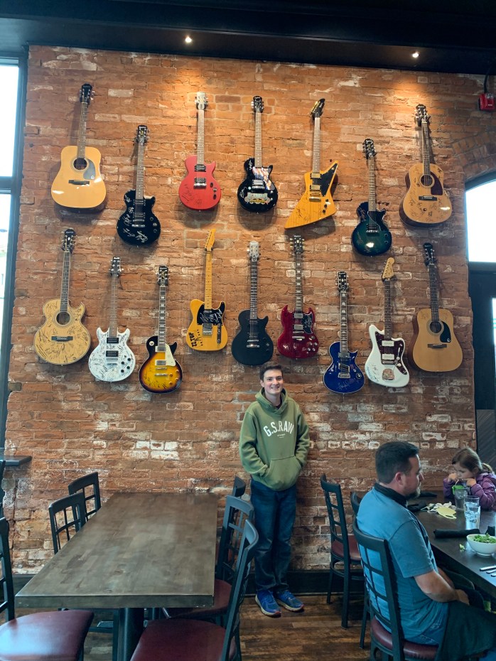 The drizzle started to fall about the time we left Mount Rushmore. We decided to drive to Deadwood and Sturgis. Lunch in Deadwood was at Jacobs Brewhouse & Grocer. It was a cool, little joint. They opened two months ago and our server told us that the Food Network was there yesterday. They had walls of guitars signed by musicians. Next to our table were guitars signed by Paul McCartney, ZZ Top, The Beach Boys, Alabama, and Styx. Edwin loved it! The food was great, too. Edwin, Mont, and I all had the pretzel brisket sandwiches with beer cheese dip. Maybe we will see it featured on Food Network?