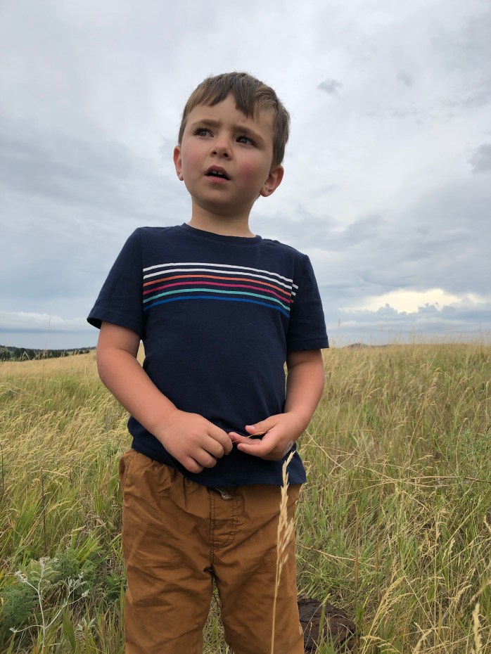 I’m glad that we chose the downhill way. I said, “Morgan, will you PLEASE try to alternate your feet? Right. Left. Right. Left.” while the bigger kids bounded on ahead. He has fallen in love with many rocks, flowers, and pine cones and has become quite the collector this trip.
