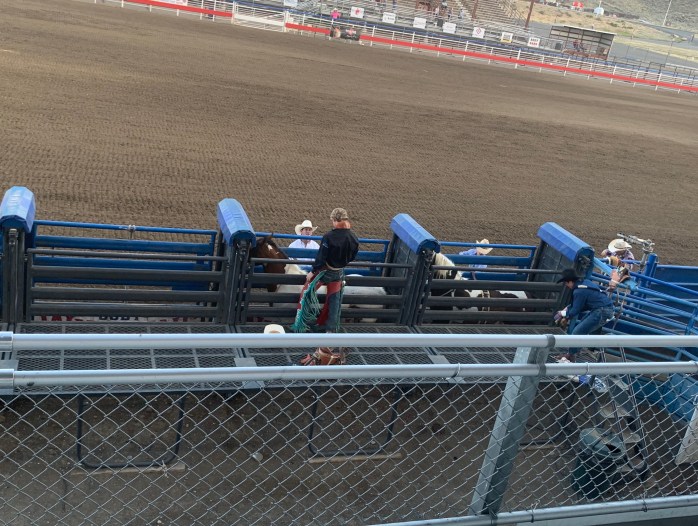 After that, we headed to the rodeo! Cody is the Rodeo Capital of the World. They have a nightly rodeo at 8PM. I had bought tickets ahead of time; they had limited capacity seating right now due to COVID-19. The arena was outdoors. There were quite a few people, but groups spread apart. Announcements were made asking patrons to respect social distancing. Almost no one wore masks, though. We allowed the crowd to disperse a bit before walking back to our car. The show was amazing! I was surprised at how much I got into watching the ladies’ barrel racing. It was so exciting! Our seats were right above the shoots so we could watch the cowboys get on the horses and bulls. I was impressed with how they involved the younger kids. Young cowboys and cowgirls were given not only the opportunity to show their skills, but also allowed to help out during the show.