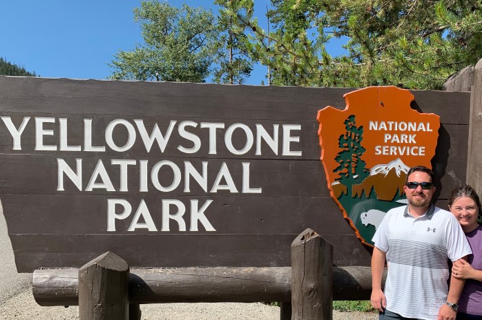 We entered Yellowstone through the East Entrance. There were quite a few visitor’s centers, restrooms, and other facilities closed in the park due to the pandemic. We picked up some sandwiches and lunchables from a general store inside of the park. A lady working at the store recommended our picnic spot–an area behind the closed Grant Village visitor’s center. We had an unobstructed view of the West Thumb section of Yellowstone Lake all to ourselves. A ranger outside of the center gave me a piece of paper with the passport stamp on it since the visitor’s center is closed.