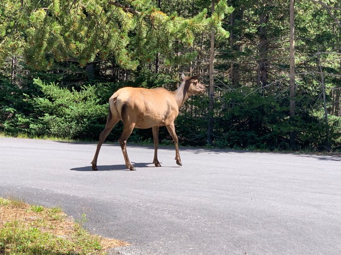 I need to add here that we STILL have not seen many animals. We saw a lone female elk today right after lunch. She walked across the parking lot making some loud, crazy noises–like she was calling to her baby or something. Anyway, she was very cool…but really the only interesting animal that I saw today.