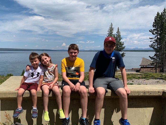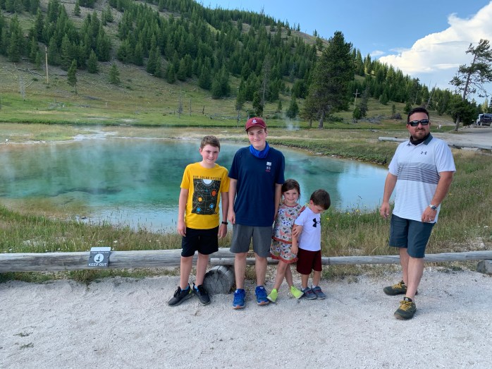 After lunch, we headed up to Old Faithful. This spot was definitely a bottle-neck for the crowds. There were lots of benches around the geyser-watching area. It was very hot and sunny with no shade. Then, GUESS WHAT HAPPENED? (You Mamas probably already know.) We waited for about 30 minutes. It was about five minutes before the next predicted eruption time…and Morgan had to pee. Yep. He loudly declared, “Mama!!!! I’m about to pee myself!!!” Great. Kevin, having seen the Old Faithful eruption before, heroically offered to take him to the restroom. They got back to us during the last 30 seconds of the eruption. It took a couple of minutes to get out of the parking lot during the mass exodus. Check that off of my bucket list.