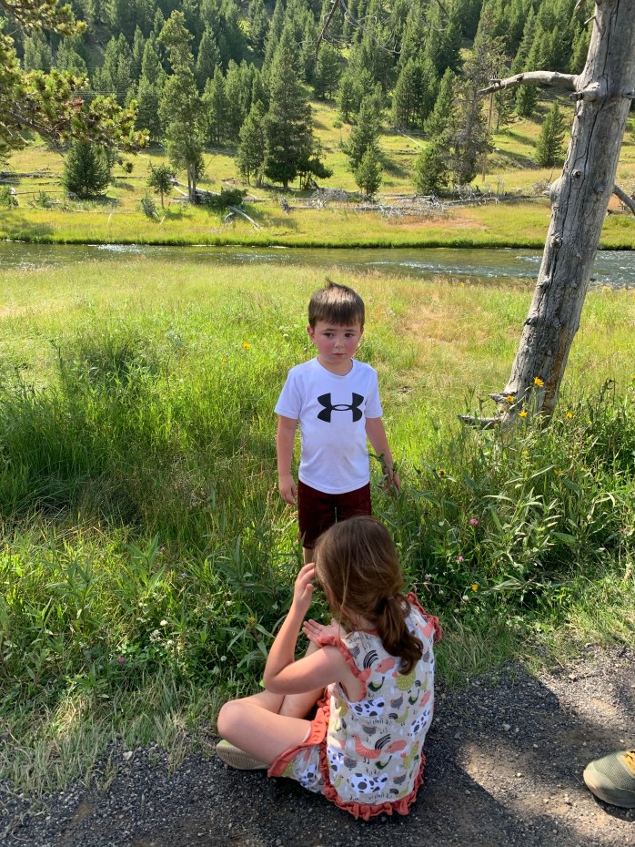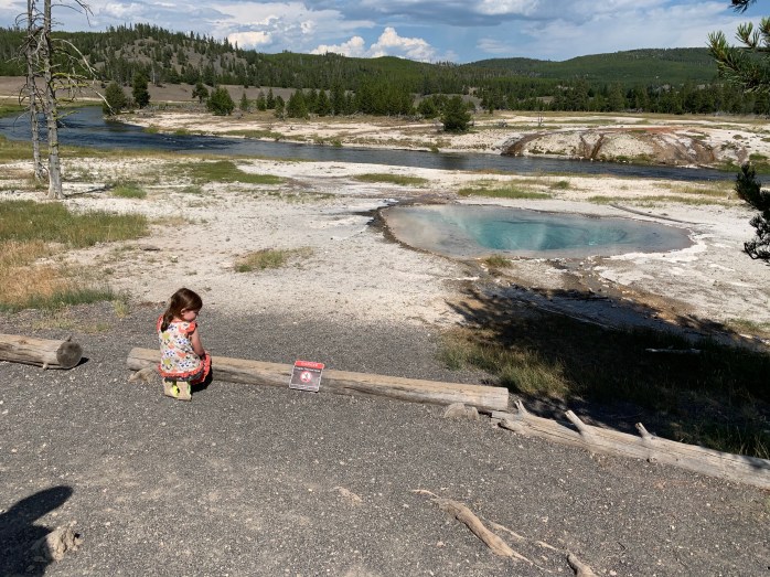 We headed northwest toward the Meyer Geyser Basin–looking for the Grand Prismatic Spring. After pulling off into the parking lot that we thought led there, we headed up the trail to nowhere. (Well, I think in actuality it led to Fairy Falls, but we didn’t make it that far.) Morgan had a meltdown about 20 minutes into our hike, dug in his heels, and refused to go any farther. I sat down with him on the side of the path and sent the others onward. I don’t think they made it much farther before they realized that the trail did not lead to the Grand Prismatic Spring. They turned around and met back up with Morgan and me. We never did find it. There were other smaller springs along the way, though, that were pretty. If you want to see an actual picture of the Grand Prismatic Spring, though, you will have to do as we did and Google it.
